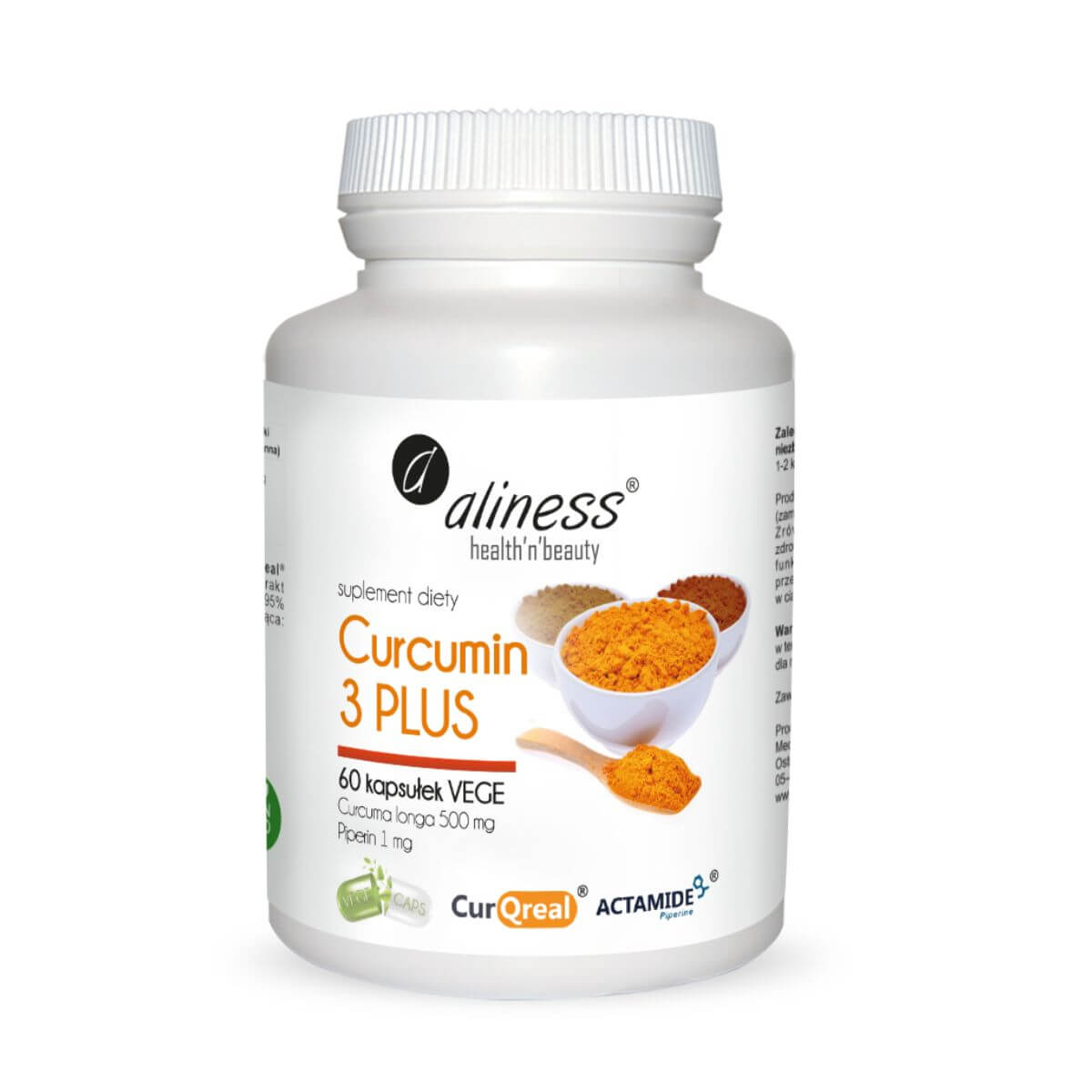 Aliness Curcumin Complex3 PLUS to kompozycja w 100% naturalnych kurkuminoidów, w postaci opatentowanego ekstraktu z kurkumy CurQreal®. W skład kompleksu wchodzą trzy związki chemiczne występujące naturalnie w kurkumie: kurkumina, desmetoksykurkumina (DMC) i bis-desmetoksykurkumina (BDMC). Aby zwiększyć biodostępność kurkuminoidów, skład wzbogacono o naturalny ekstrakt z pieprzu ACTAMIDE®, który zawiera 95% piperyny i jest pozyskiwany wyłącznie na drodze wodnej ekstrakcji.
